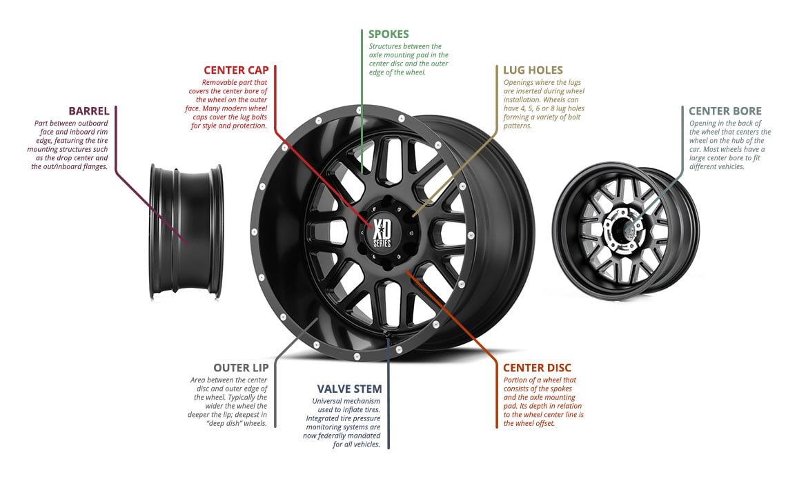 Wheels are an integral part of your ride’s look and performance. Nothing enhances the look of a vehicle like a new set of aftermarket wheels and tires. But, wheels come in a dizzying array of sizes, styles, and materials. There are so many types of wheels and the terminology for wheel parts can be confusing. Exactly what is the difference between a wheel and a rim? What do the numbers about a wheel mean?