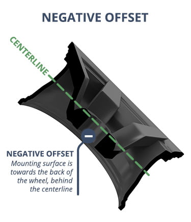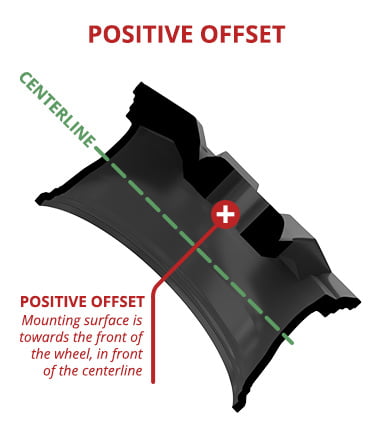 With a 0 (zero) offset, the mounting surface is exactly in the center of the wheel. With a positive offset, the mounting surface is to the front of the wheel. It is expressed as the number of millimeters from the centerline. With a negative offset, the mounting surface is to the back side of the wheel. It is expressed as the number of millimeters from the centerline. For example, if a wheel is 9 inches wide, the centerline is at 4.5 inches. A positive offset is the number of millimeters beyond 4.5 inches and a negative offset would be the number of millimeters in the opposite direction.
